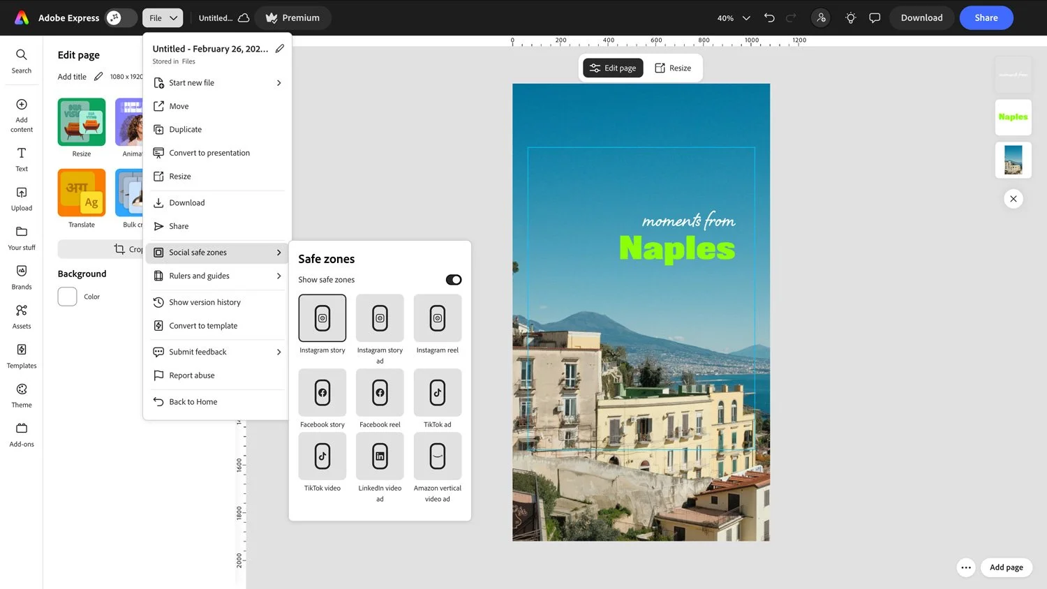 When you're designing for TikTok, Instagram Reels, or YouTube Shorts, Express can show you exactly where platform UI elements (like buttons, captions, and profile icons) will appear. You see the safe area before you export, so your text and key visuals never get covered.