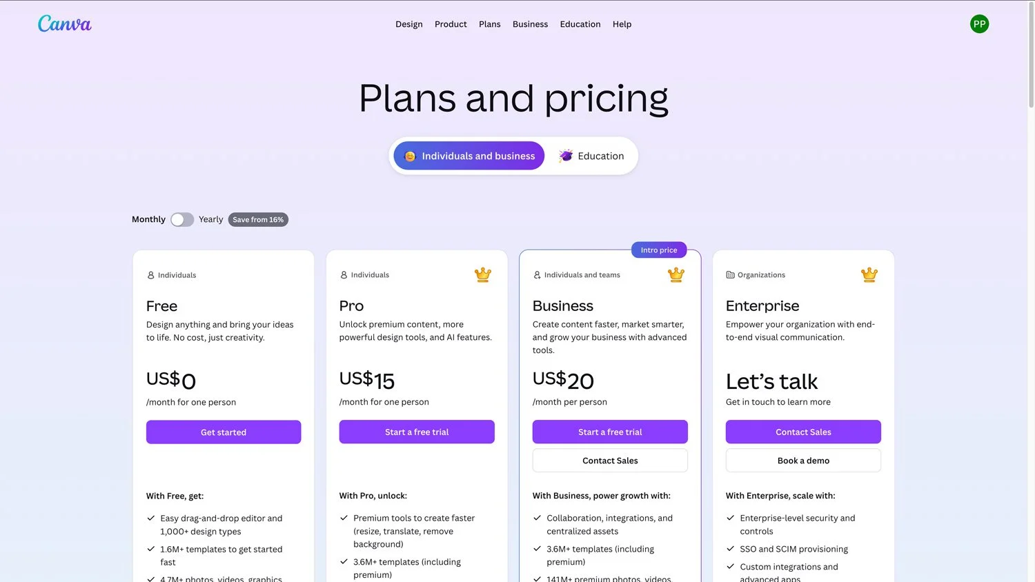Canva offers four tiers: Free, Pro ($15/month), Business ($20/month per person, currently marked as an intro price), and Enterprise (contact sales).