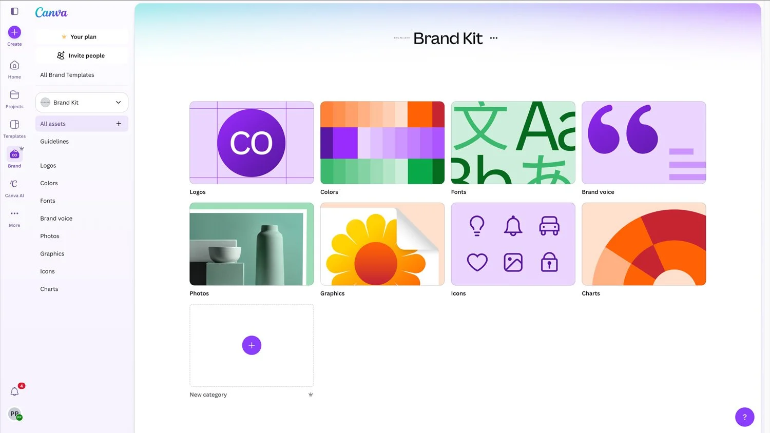 Canva lets you upload your logos, colors, fonts, photos, graphics, icons, and even charts. They've also added Brand Voice (to maintain consistent tone in AI-generated copy) and Guidelines (where you can document how your brand should be used). I actually love the Guidelines feature and wish Express had something similar.
