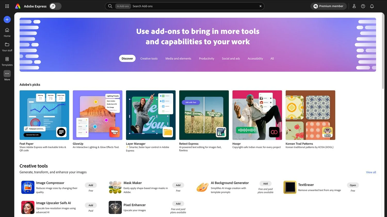 Adobe Express takes a more curated approach. Fewer add-ons, but they're higher quality and easier to understand at a glance. The ones available have become tools I use every single day for what I'm creating. Both platforms now offer mockups to place your designs onto t-shirts, phones, posters, and other products.