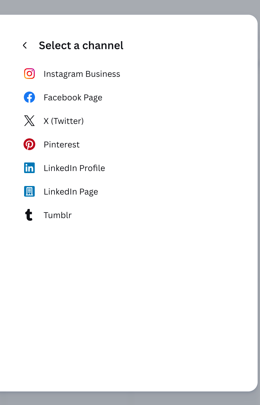 In Canva, you can schedule your content only with a Pro plan ($15/month). There are many channels you can schedule content to, including Instagram, Facebook, Twitter, Pinterest, LinkedIn, Slack, and Tumblr.