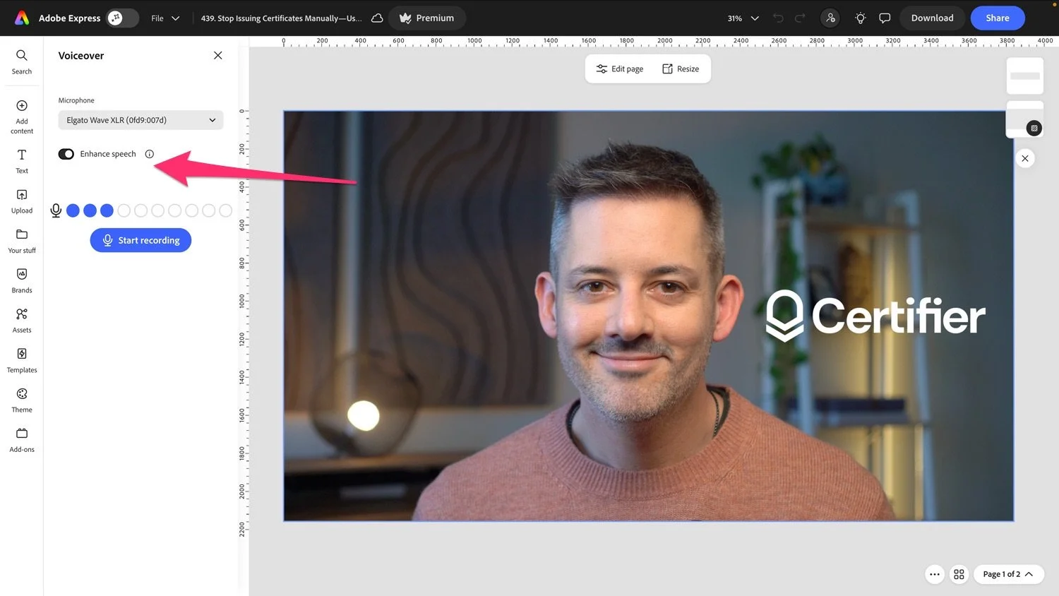 Both platforms now offer one-click audio cleanup. Adobe Express calls it Enhance Speech; Canva calls it Enhance Voice. Both remove background noise and bring your voice to the forefront.