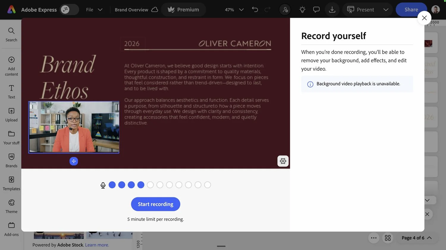Adobe Express now includes Self Record, allowing you to record video directly in the platform. It supports up to 5-minute recordings with background removal, and recordings are stored for reuse across projects. Great for adding personal touches to tutorials or social content.