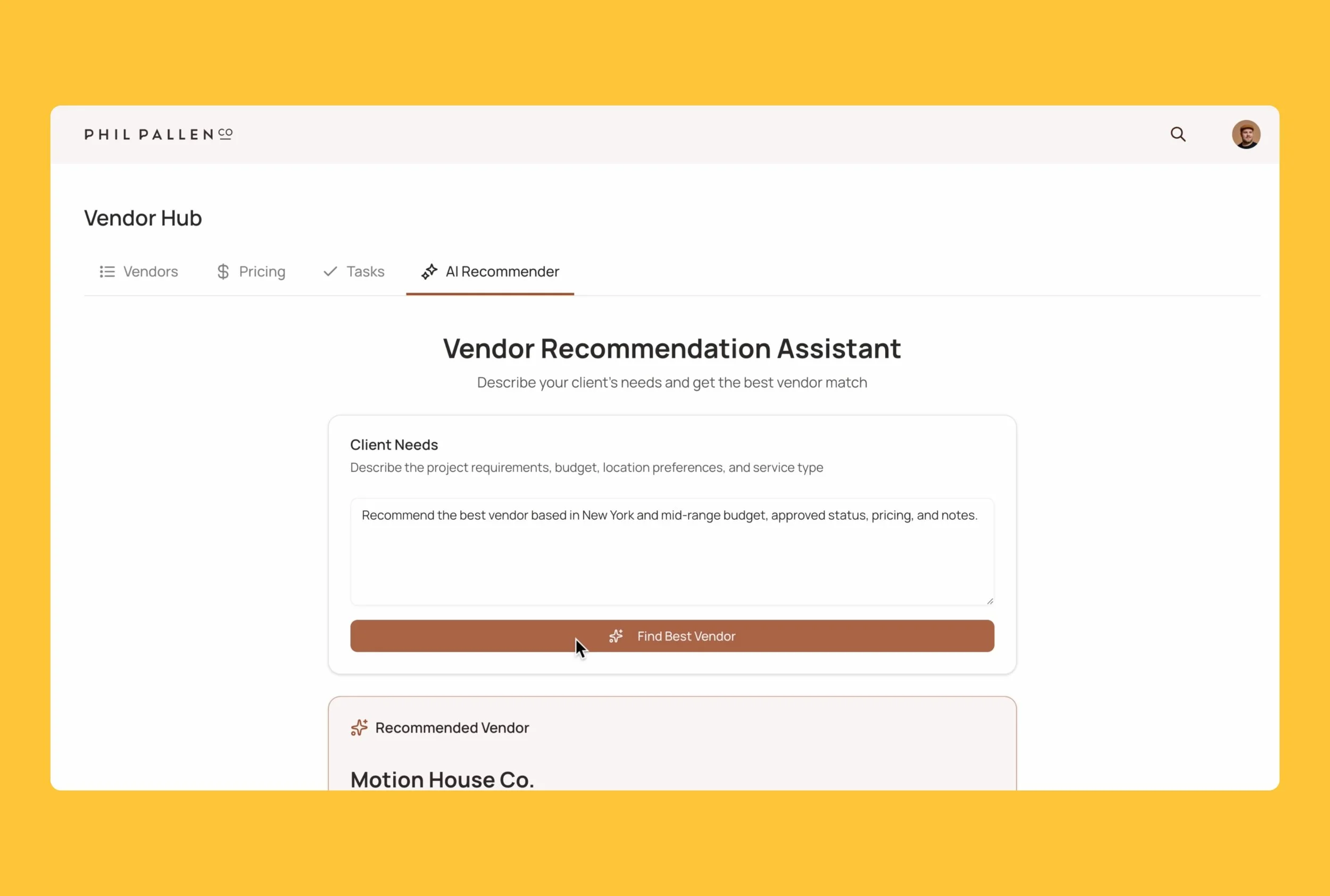 The AI reads from live vendor data and recommends the best match based on approval status, ratings, pricing, and existing notes.