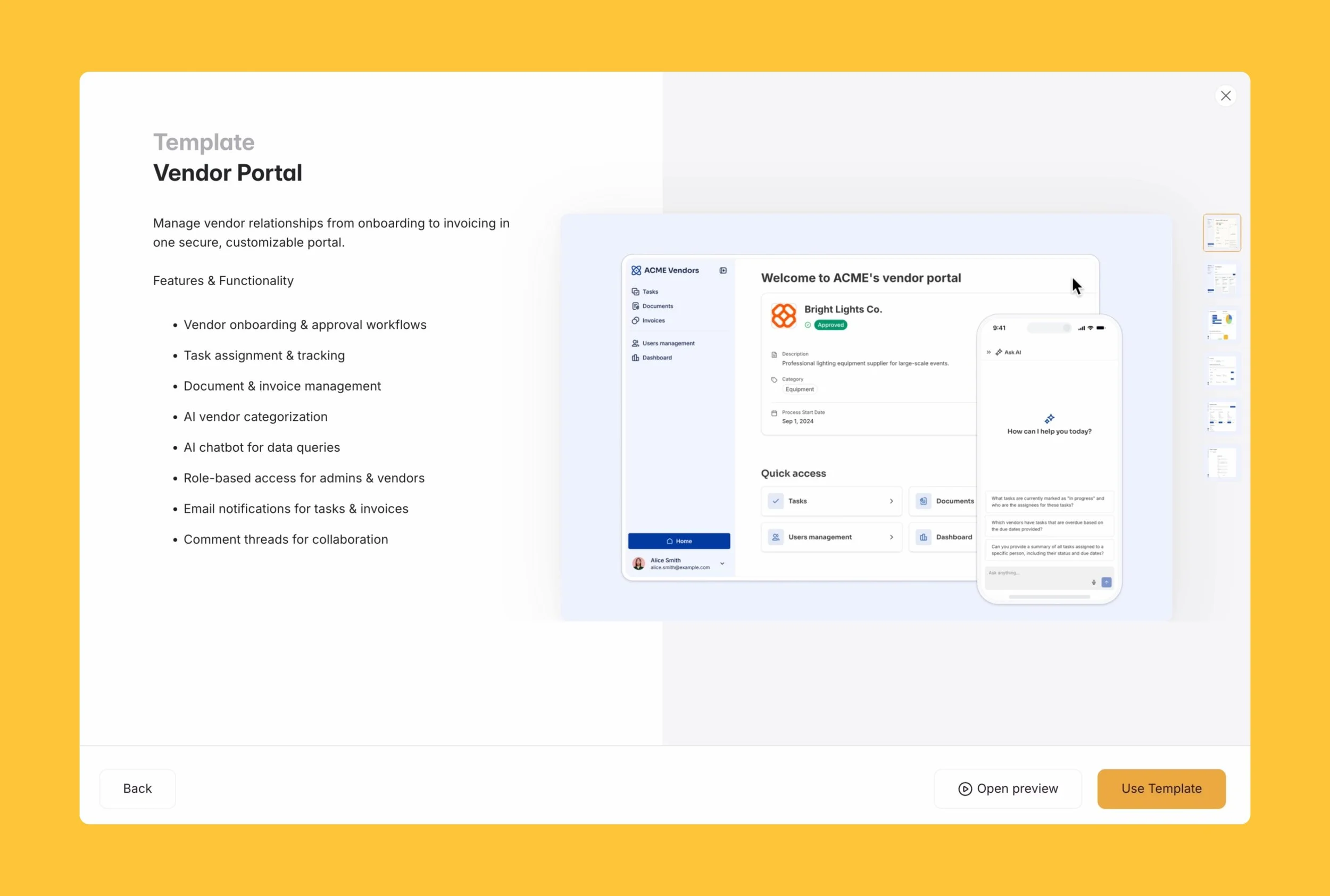 Softr’s Vendor Portal template provides a strong starting point with onboarding workflows, task tracking, invoicing, and role-based access built in.